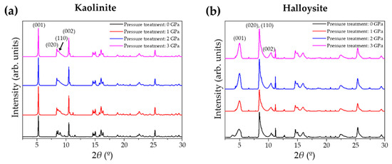The kaolinite used in this study was a KGa-1b sample approved by Clay Minerals Society. The halloysite was from Nanoclay (Product Number: 685445) sold by SIGMA-ALDRICH (St. Louis, USA). Initial characterization of the samples was performed using X-ray diffraction (MicroMax-007HF/R-axis IV++, Rigaku, Tokyo, Japan) at the UNIST-PAL 6D beamline at PAL (Pohang Accelerator Laboratory), Korea. Each powder sample was loaded into a borosilicate capillary with Ø 0.3 mm. A monochromatic X-ray of 18.986 keV (λ = 0.6530(1) Å) was selected by Si (111) double crystals and then collimated to a size of 2880 mm × 2880 mm. A CCD detector (MX225-HS, Rayonix) (Rayonix, Evanston, USA) placed at a distance of 185 mm from the specimen was used for data measurement for 150 s after calibration using LaB6 standard (lanthanum hexaboride, SRM 660c) (NIST, Gaithersburg, USA). Figure 1 shows the XRD patterns of the kaolinite and halloysite starting samples together with data measured after each pressure treatment.