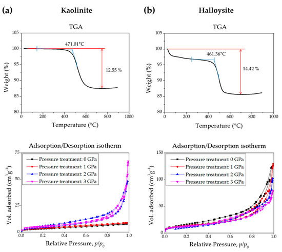 TGA and Brunauer–Emmett–Teller (BET) adsorption/desorption isotherms data of (a) kaolinite and (b) halloysite before and after pressure treatments.