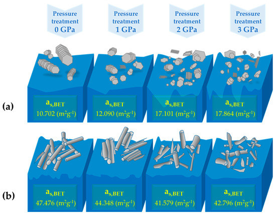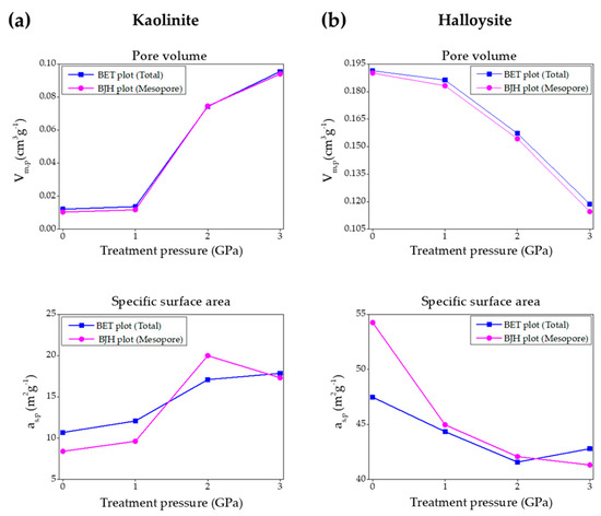 BET results of (a) kaolinite and (b) halloysite before and after pressure treatments.