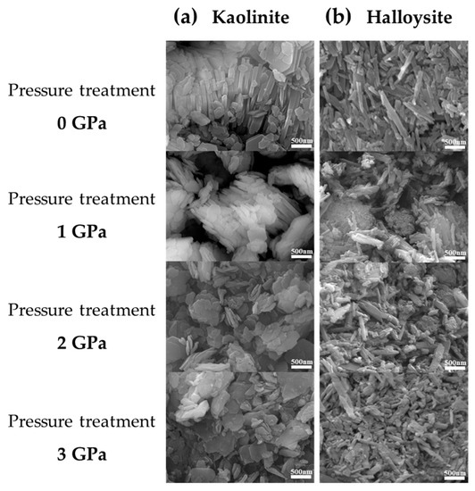 SEM images of (a) kaolinite and (b) halloysite before and after pressure treatments.