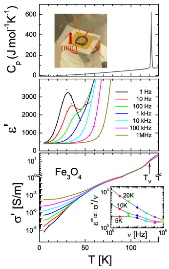- Schrettle, F.; Krohns, S.; Lunkenheimer, P.; Brabers, V.A.M.; Loidl, A. Relaxor ferroelectricity and the freezing of short-range polar order in magnetite. Phys. Rev. B 2011, 83, 195109. [Google Scholar] [CrossRef]