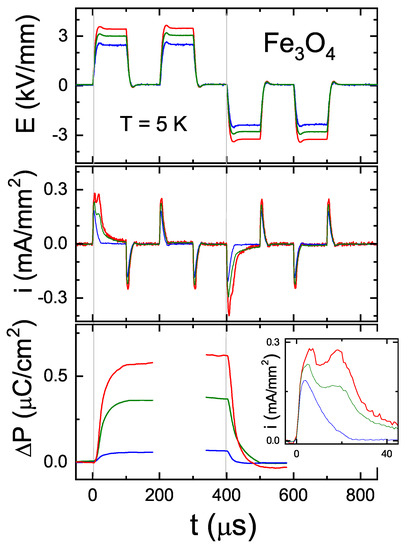 Based on the above, we have chosen a temperature of 5 K and a time scale of 1 ms for our PUND [19,20] measurements (Figure 3), a factor of 100 slower than used by Alexe et al. [18]. We applied two positive and two negative pulses of trapezoid shapes with relatively steep flanks, as displayed in the top panel of Figure 3. Shown are the results for three different pulse heights, corresponding to 3.5, 3, and 2.5 kV/mm, displayed in red, green, and blue, respectively. These values are in the range of the coercive field as indicated by the measurements performed at 0.5 kHz by Schrettle et al. [21]. The current-response, shown in the middle panel, is dominated by peaks at the flanks of the pulses and for the second and fourth pulses is very close to simply being proportional to the time-derivative of the electric field. This is thus a capacitive response and has to be expected to be present given that the sample plus electrodes forms a capacitor. Looking closely at the current responses in the middle of the second and fourth pulses, one can see that there is a very small Ohmic contribution (constant current for constant electric field) as well.