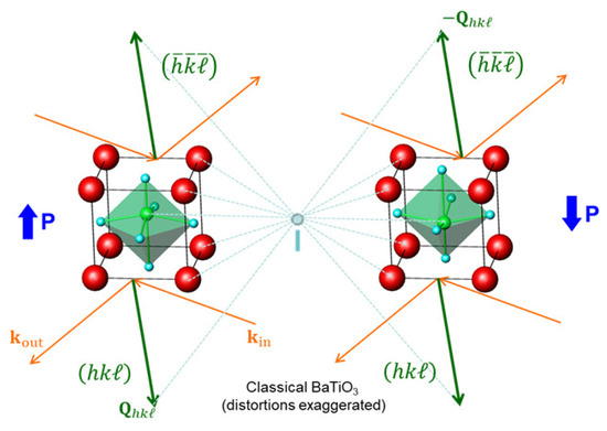 However, we still require direct proof of the intrinsic nature of the observed switchable polarization. In an intrinsic ferroelectric, the polarization corresponds to a structural polar distortion, with the state with opposite polarization corresponding to the inversion twin of the structure. For the example of classical ferroelectric BaTiO3 [34], this is sketched in Figure 4, where the polar distortion (off-center displacement of the Ti atom) has been exaggerated. In a diffraction experiment, scattering on some () Bragg reflection, going from a non-centrosymmetric structure to its inversion twin has the same effect as inverting the diffraction geometry, that is, incoming and outgoing wavevector and thus also the vector, as also indicated in the figure. Thus, switching the polarization of the structure alternatingly forth and back is the same as alternatingly measuring () and its Friedel mate (). Normally, the Friedel law holds, which states that the intensities of Friedel mates must be equal [37]. However, for non-centrosymmetric structures, the Friedel law holds only in the absence of absorption, that is, when the atomic scattering factors are purely real. Slightly above absorption edges, the atomic scattering factors can acquire a significant imaginary component due to resonant (anomalous) scattering. This breaks the Friedel law and leads to an intensity difference between the Friedel mates, although it will typically be rather small [38]. Thus, with an appropriately chosen photon energy and with application of electric fields in-situ, the switching of the polar structure may be observed as a small change in the intensity of an appropriately chosen Bragg reflection, providing the ultimate direct proof of intrinsic ferroelectricity. This principle has been used successfully by Azimonte et al. [39], who observed an intensity difference of about 5% between the intensities of a reflection on multiferroic DyMn2O5 after applying positive and negative electric fields, respectively. Resonant scattering has also been used to to reconstruct displacement of atoms in BaTiO3-based ferroelectric ceramics during polarization inversion [40]. An intensity difference of about 1% for 111 Bragg reflection was observed for two inversion-related polarization states.