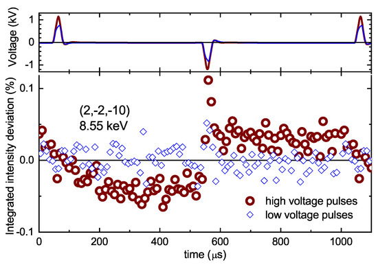 During switching, the position of the Bragg reflection may slightly move due to piezoelectricity [40,45]. In order to ensure that at each time the full integrated intensity is obtained, we used a wide open detector and collected a full time-resolved rocking curve. For each rocking angle, the voltage pulses were applied, with the time-resolved detector readings binned into 1000 time channels. The results then provide rocking curves for each time channel. We noticed no position shifts of the rocking curve as a function of time, confirming that we indeed obtained full integrated intensities. The time-dependence of the deviation of the intensity of the reflection from its time-average is shown in the bottom panel of Figure 5 for two different pulse heights. For the lower voltage pulse (blue) no systematic intensity variation is discernible. For the higher voltage pulse (brown), however, a systematic time-dependence, correlated to the times of the voltage pulses, is clearly visible. There are some transient effects close to the times of the pulses themselves, which are asymmetric for the positive and negative pulse (c.f. the anisotropy visible in the switching in Figure 3 and in in-situ diffraction experiments on other compounds [40,44]), and which depend on the movements of the atoms switching mechanism [40]. However, the main effect is that, in between the pulses, the intensity is clearly above average in the interval after the application of the negative pulse and below average in the interval after the application of the positive field pulse. Identifying these two regions with the Friedel mates, we observe an intensity difference of about 0.1%.