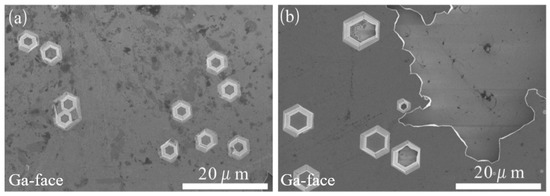 SEM images of the etched metal–organic chemical vapor deposition (MOCVD) grown GaN surface in H3PO4 at 230 °C for (a) 10 min and (b) 14 min.