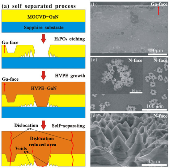 The schematic diagram of (a) the self-separating process. (b) Cross-section SEM image of the free-standing GaN crystal. (c) SEM image of the free-standing hydride vapor phase epitaxy (HVPE)–GaN N-polar face. (d) After HVPE growth, the pyramids show six facets.