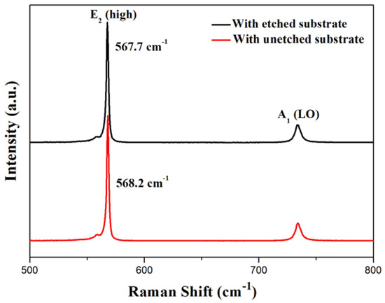 Raman spectra of HVPE–GaN with and without substrate. The wave number of E2 (high) mode of the HVPE–GaN grown on etched and unetched substrate is detected at 567.7 cm−1 and 568.2 cm−1, respectively.