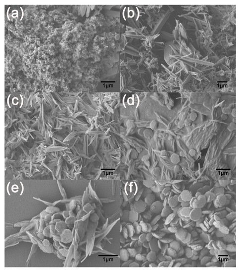 SEM images of products obtained in OS route at different times: (a) 0 min; (b) 10 min; (c) 20 min; (d) 30 min; (e) 50 min; and (f) 70 min.