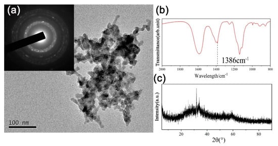 Phase analysis of the particle aggregates precursor at 0 min in OS route: (a) TEM and SAED pattern; (b) FT-IR spectra; and (c) XRD pattern.