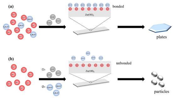 As described above, ZnO plates formed after the Zn(OH)2 precursor formed. Hydrothermal treatments in two routes were the same comparing OS route with TS route. Thus, the precursor should be the cause of the final structural difference. The condition where precursor formed differed in two routes. Citrates existed when Zn(OH)2 precipitated in OS route but did not exist in TS route. It can be inferred that citrate influenced the formation of the precursor. The soluble zinc species concentration distribution was calculated, as shown in Table 1, to analyze the solution condition before Zn(OH)2 precipitated, according to the complex constant at 25 °C (Table S1) [29] and the measured pH (5.2). The concentrations of Zn2+ and Zn2+-C6H5O73− were 4.59 × 10−2 mol·L−1 and 4.99 × 10−2 mol·L−1, respectively, indicating most citrates existed in the form of Zn2+-C6H5O73− due to its large complex constant (2.51 × 1011). These two ions were the main species in the OS-solution, while the main species in TS-solution was Zn2+. The distribution of Zn2+-OH−-H2O system was also calculated according to the complex constant in Table S1, as displayed in Figure S1 (Supplementary Materials). According to the calculation, the main species at pH = 9 was Zn(OH)2(aq). Zn(OH)2(aq) is not stable in solution (Ksp[Zn(OH)2] = 1.2 × 10−17). Thus, the addition of sodium hydrate caused the formation of insoluble Zn(OH)2 and the concentration of zinc species decreased to 4.42 × 10−2 mol·L−1 (Figure 4). It can be inferred that the decrease of the concentration was caused by the precipitation of Zn2+ and the main zinc species remained in solution was Zn2+-C6H5O73−. After 30 min reaction, concentration of soluble zinc decreased to 2.25 × 10−2 mol·L−1 from (Figure 4). It was caused by the growth of Zn(OH)2, and it can be inferred that Zn2+-C6H5O73− participated in the formation of Zn(OH)2.