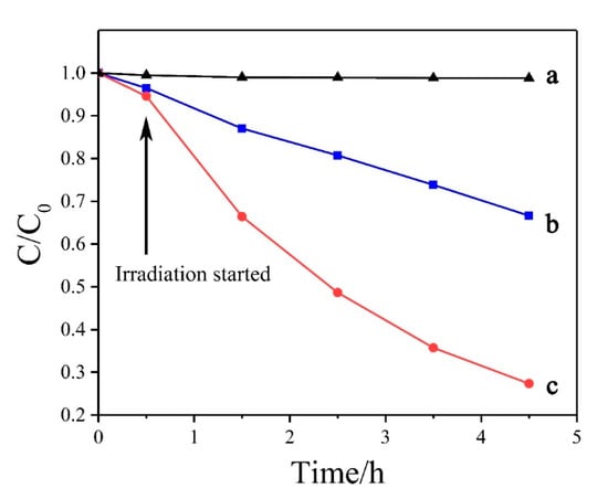 The photocatalytic activity of the samples was examined for MB photodegradation in aqueous phase under UV light irradiation. The test was performed in a 100 mL beaker charged with 50 mL of 10 mg·L−1 MB solution and 30 mg of the sample. The mixture was firstly kept in a dark place for 30 min to reach adsorption–desorption equilibrium before irradiation. Then, the mixture was exposed to the radiation source. Two milliliters of the solution were taken and filtrated by a needle filter every hour to test the photodegradation performance by a UV-Vis spectrophotometer (TU-1901) (Persee Analysis General Instrument Co., Ltd., Beijing, China). The UV light irradiation source was a UV lamp (Philips, 6 W). All experiments were carried out at room temperature (25 °C) and the mixture was suspended by a magnetic stirrer.