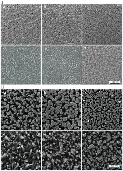 During the annealing step, a film made of larger discrete crystallites is formed (Figure 1Ⅰ). For both annealing atmospheres, the sizes of the seed layer crystallites are systematically larger than the size of the crystallites of the seed layer before annealing (Figure 2), where the size ratio depends on the preheating temperature. After annealing in the air, the seed layer crystallites preheated at 300 °C and 350 °C had a rounded shape with diameters ranging from 50 to 110 nm with a relatively broad distribution of sizes. Histograms of the size distributions can be seen in the Supplementary Materials (Figure S1). When the preheating temperature was increased to 400 °C, the diameter decreased and the size distribution was significantly narrowed (Figure 1Ⅰ). The surface roughness was low at all preheating temperatures with a moderate decrease for the samples preheated to 400 °C (Figure 3). For the seed layers annealed in the air at 600 °C, a good vertical orientation was achieved for all preheating temperatures. Highly c-axis textured seed layers with a low roughness and porosity promote nucleation on the top free surfaces of the crystallites []. The nanorods then grow epitaxially and adopt a c-plane orientation of the seed layer crystallites, which promotes vertical alignment of the nanorod array (Figure 1Ⅱ). The size analysis revealed that the diameters of the nanorods were strongly correlated with the sizes of the crystallites of the seed layers. Consequently, the nanorods grown on the seed layers preheated to 400 °C showed a narrow size distribution (Figure 1Ⅰc and Figure 2). The nanorods had a moderately larger diameter than the seed layer crystallites. This behavior is related to the not negligible lateral growth rate of the nanorods in nonpolar directions, which can be controlled by the growth parameters, dopants, and surfactants [,,].