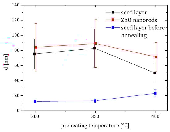 Size analysis of the seed layer crystallites after preheating at different temperatures (blue full squares) and after complete heat treatment including different preheating temperatures and annealing in the air at 600 °C (black void squares). Furthermore, the red full squares represent the diameters of the nanorods grown on the seed layers preheated at different temperatures and annealed in the air at 600 °C.