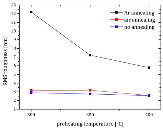 Dependence of the root-mean-square (RMS) roughness on the heat treatment conditions employed in the preparation of the seed layers. The heat treatment involves preheating at different temperatures and annealing either in the air at 600 °C (red) or in Ar at 800 °C (black) or without any annealing (blue).