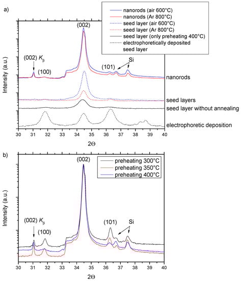 The crystalline analysis by XRD was carried out on both the seed layers and the nanorod arrays grown on the seed layers (Figure 4). The XRD patterns with the y-axis in logarithmic scale were analyzed in the range of the angle 2θ between 30° and 40°, where the three main reflections are located for the ZnO wurtzite structure. The complete XRD scans (2θ ≈ 30°–80°) showed reflections corresponding uniquely to ZnO, except for weak reflections from the Si substrate. The complete diffraction patterns are shown in the Supplementary Materials (Figure S2). First, we discuss the diffraction patterns of the seed layers. For comparison, we show the electrophoretically deposited seed layer with the intensities of the three principal diffraction peaks (100), (002), and (101) corresponding to a random orientation of ZnO nanoparticles. The XRD pattern for the seed layer after preheating at 400 °C was dominated by the (002) reflection, which corresponded to a strong c-axis texture. The same applies to the seed layers after annealing in both air at 600 °C and Ar at 800 °C; however, the full width half maximum of the peak was significantly narrowed. This points to a conclusion that after preheating, the small crystallites are c-axis oriented and that during annealing, the crystallites coalesce into larger ones without losing their orientation. As claimed when the morphology of the seed layers was discussed, the nanorods grow epitaxially and adopt a c-plane orientation of the seed layer crystallites. This translates into the vertical alignment of the nanorods and the corresponding XRD patterns are again dominated by the (002) reflection (Figure 4a). Similar XRD patterns were measured for the seed layers preheated to 300 °C and to 350 °C and subsequently annealed in the air at 600 °C (Figure S2). This situation was different for the annealing in Ar at 800 °C (Figure 4b), where the high preheating temperature of 400 °C was shown to be crucial for the suppression of the (100) and (101) peaks and of the corresponding vertical misalignment.