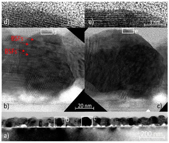 The seed layer preheated at 400 °C and annealed in the air at 600 °C was further investigated by TEM and HRTEM. The low-magnification image shows a seed layer of approximately 100 nm in thickness containing crystallites with diameters ranging from ~40 to 60 nm (Figure 5a). The seed layer was not fully in contact with the substrate. The gaps at the interface formed as a result of the shape of the crystallites varying from quasi-spherical to columnar. Moreover, this non-uniformity also supports the conclusion from [] that the structural role of the substrate is negligible and the ZnO crystallites are attached only by weak bonding to the native amorphous silicon oxide layer, which is approximately 10 nm thick. Two crystallites from the seed layer were chosen for more detailed imagining along the <11−20> zone axis (Figure 5b,c). Both crystallites were quasi-spherical, terminated with c-planes (0001), and tapered with the side facets composed of semi-polar planes. The crystallite in Figure 5 contains several basal stacking faults (BSFs), which were not terminated by partial dislocations, but by free surfaces or grain boundaries, as reported in []. The c-plane surfaces can be considered atomically sharp according to HRTEM images (Figure 5d,e).