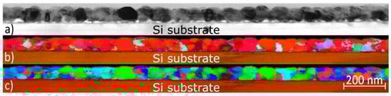 To prove the conclusions from other characterization techniques, the seed layers preheated at 400 °C and annealed in the air at 600 °C were further investigated by ACOM-TEM (ASTAR) (Figure 6). The alignment of the crystallites along the c-axis strongly prevailed, which was confirmed by the red color in Figure 6b. The ASTAR maps recorded in the basal plane (Figure 6c) did not show any preferential in-plane orientation.