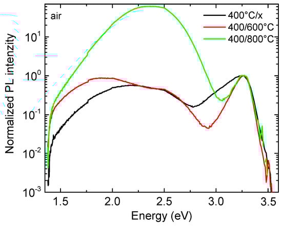 Room temperature photoluminescence spectra of the seed layer preheated and annealed in the air at different temperatures. Black line 400 °C; red line 400 °C/600 °C; green line 400 °C/800 °C.