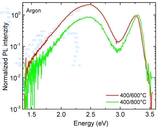 The NBE emission after annealing in argon (Figure 8) showed a similar behavior to that in air. The FWHM of the DLE peak was significantly lowered with an increase in the annealing temperature. In the DLE spectra, two green bands with the maxima at 2.47 eV and 2.35 eV were observed []. The integral intensity of the DLE substantially decreased and the NBE/DLE intensity ratio increased when the temperature was increased from 600 °C to 800 °C. Such behavior is typical for ZnO, which is annealed in an inert atmosphere []. The increase in the NBE/DLE intensity ratio indicates substantial improvement of the optical and structural properties of the ZnO seed layer.