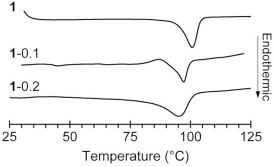 Differential scanning calorimetry (DSC) curves of 1, 1-0.1, and 1-0.2.