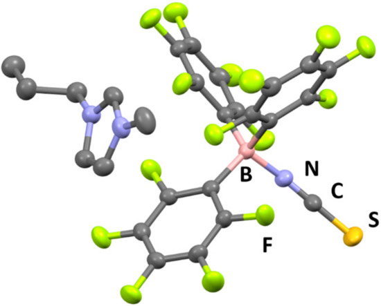 The crystal structure of 1 was revealed by single-crystal X-ray diffractometry (XRD) at −120 °C (Figure 3), which showed that the [C3mim][SCN] and B(C6F5)3 moieties are located in the crystal lattice of 1 in a 1:1 molar ratio. The formation of a coordinative interaction between the N atom of the thiocyanate anion and the B atom of B(C6F5)3 was also confirmed, since the boron center exhibits a tetrahedral structure with an average N–B–C bond angle of 107.5°. Furthermore, the B–N bond distance in 1 was determined to be 1.54 Å, while the B-N-C bond angle was found to be 165.23°. These values are comparable to those reported for compounds with B–N bonds between cyano groups and B(C6F5)3 [16,18]. The packing view of 1 reveals a one-dimensional arrangement of imidazolium ions and adduct-type anions along the b-axis (Figure 4).