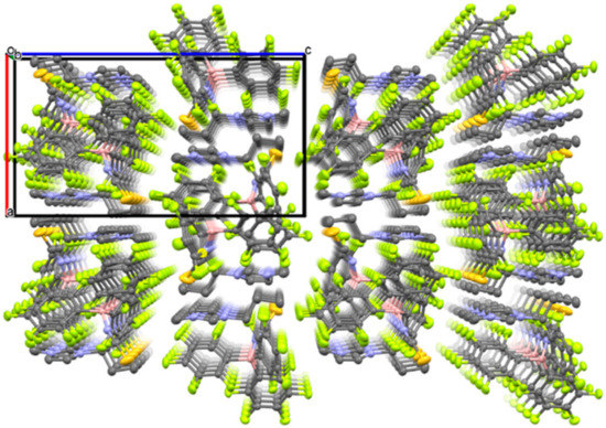 Packing view of 1 along the b-axis (C: gray, B: pink, N: blue, F: green, S: dark yellow. Thermal ellipsoids are shown at the 40% probability level. Hydrogen atoms are omitted for clarity).