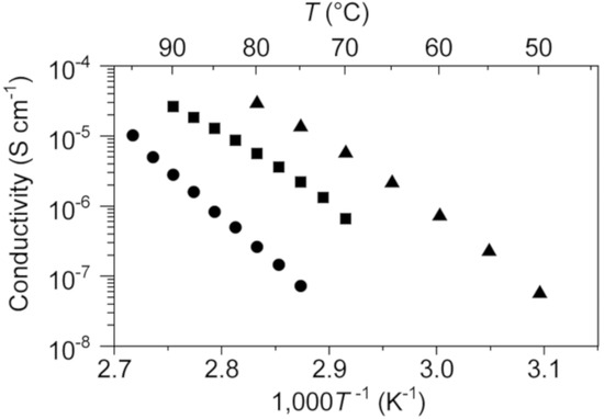 Ionic conductivities of 1 (circles), 1–0.1 (squares), and 1–0.2 (triangles) as functions of temperature.