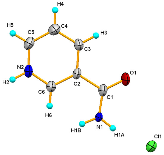 The 1H-Nicotineamidium chloride compound (C6H7N2O)+·Cl− was synthesized by slow evaporation of aqueous solution containing a 1:1 stoichiometric mixture of 1H-nicotineamide and concentrated HCl (37%). The resulting solution was stirred well then kept at room temperature. After a period of about three weeks, bulk colorless crystals were obtained. A single crystal suitable for X-ray diffraction analysis was selected and studied.
