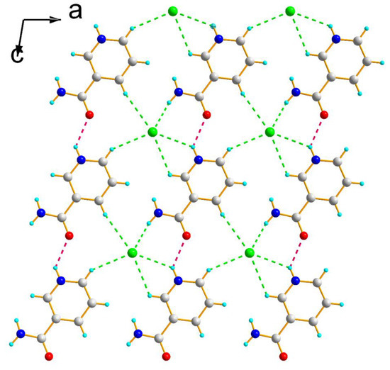 The asymmetric part of the (C6H7N2O)+·Cl− salt consists of a (C6H7N2O)+ cation and Cl− chloride anion (Figure 1). These ions are organized in the crystal to produce centrosymmetric assemblages with space group P21/m. This means that organic cations (C6H7N2O)+ and chloride anions are situated in the mirror plane (x, 1/4, z) creating strictly planar layers (Figure 2 and Figure 3). These layers are approximately parallel to each other by π–Cl− interactions between centroid of pyridinium group and chloride anions (3.46 Ǻ).