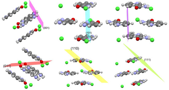 The (C6H7N2O)+·Cl− crystal surfaces have different molecular orientations, as shown in Figure 5. The (C6H7N2O)+ cations on the (001), (100) and (101) faces are organized perpendicular to the crystal plane, while the ones on the (110), (011) and (111) faces are at an angle to the crystal plane.