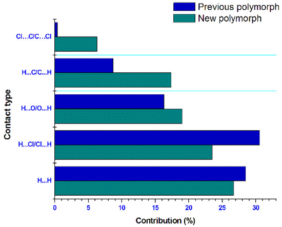 Relative contribution (%) of various intermolecular interactions to the Hirshfeld surface area of the two polymorphs.