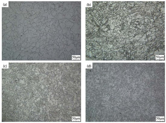 Microstructures of the Mg-2Y-0.6Nd-0.6Zr alloy. (a) as-rolled; (b) one pass; (c) four passes; (d) six passes.