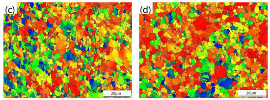 Figure 3 and Figure 4 display the microstructure and grain orientation distribution, respectively, of the Mg-2Y-0.6Nd-0.6Zr alloy subjected to rolling and after different numbers of ECAP passes. The grain size statistics and their distribution are shown in Figure 5. It can be seen in Figure 3; Figure 4 that after rolling, the grain size is relatively large, with individual large grains exceeding 30 µm and the average grain size being ~11.2 µm. After one pass of ECAP, the grain size of the alloy was remarkably reduced, some of the grains were elongated, the grain size presented a bimodal distribution, and the average grain size was ~2.43 µm. The fourth pass of ECAP led to fine equiaxed grains and the size distribution was concentrated in the range of 0–3 µm; however, at the same time, grains as large as 10 µm were also present and the average grain size was ~1.87 µm. After six passes of ECAP, the average grain size showed an increasing trend, the size of the coarse grains decreased, the grain size distribution was more homogeneous than that after four passes, and the average grain size was ~2.00 µm.