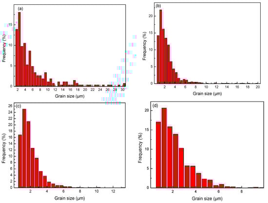 Grain size distribution of the Mg-2Y-0.6Nd-0.6Zr alloy. (a) as-rolled; (b) one pass; (c) four passes; (d) six passes.