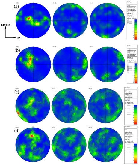 The pole diagram of the Mg-2Y-0.6Nd-0.6Zr alloy. (a) as-rolled; (b) one pass; (c) four passes; (d) six passes.