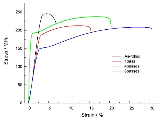 The samples after rolling and a different number of ECAP passes were subjected to a tensile test at room temperature. It can be seen in Figure 7 and Table 1 that the as-rolled alloy had the highest ultimate tensile strength and yield strength with values of 246 MPa and 216 MPa, respectively. However, the plasticity of the as-rolled alloy was extremely poor, and elongation was only 3.8%. With an increasing number of ECAP passes, the ultimate tensile strength first increased and then decreased, while the yield strength continuously decreased and the elongation continuously increased. After the first pass of ECAP, the ultimate tensile strength and yield strength were significantly reduced to 213 MPa and 182 MPa, respectively, but the plasticity was improved and the elongation increased to 12.3%. After four passes of ECAP, the ultimate tensile strength was greatly improved compared with the first pass of ECAP, and the yield strength did not change appreciably. The ultimate tensile strength and yield strength were 238 MPa and 180 MPa, respectively, and the elongation increased further to 19.7%. After six passes of ECAP, the alloy had the lowest ultimate tensile strength and yield strength with values of 209 MPa and 148 MPa, respectively, but the elongation reached 27.5%.