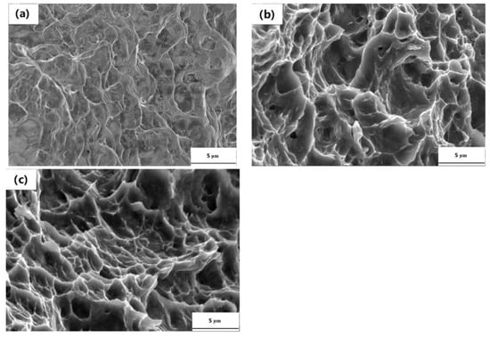 Figure 8 presents the tensile fracture morphology of the Mg-2Y-0.6Nd-0.6Zr alloy subjected to rolling and a different number of ECAP passes. The fracture of the as-rolled alloy (Figure 8a), is relatively flat and bright, which is a typical brittle fracture, indicating that the plasticity of the as-rolled alloy is poor. It can be seen in Figure 8b that after four passes of ECAP, a large number of dimples appeared on the fracture surface of the alloy, which indicates a typical ductile fracture, meaning that the plasticity of the alloy after ECAP was greatly improved compared with that of the as-rolled alloy. After six passes of ECAP, the dimples on the fracture surface were more uniform and deeper than those in the fourth pass, as shown in Figure 8c. This indicates that the plasticity of the alloy after six passes of ECAP is further increased compared with that after four passes of ECAP, which is consistent with the room temperature tensile test results.