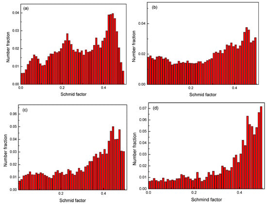 The Schmid factor distribution of the Mg-2Y-0.6Nd-0.6Zr alloy. (a) as-rolled; (b) one pass; (c) four passes; (d) six passes.