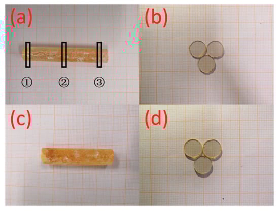 The crystals which were grown by the Bridgman method with different Sm3+ concentrations, which are shown in Figure 1. There were a few expelled impurities observable on the top of the crystals. The diameters of the crystals were 10 mm with a length of 50 to 65 mm. Because of the stripping of the Pt crucible from the crystals, the surface of the crystals was opaque. As shown in Figure 1b,d, the crystals were transparent after cutting and polishing.