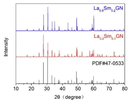 Figure 2 shows the XRD patterns of the as-grown La1 − xSmxGN (x = 0.1,0.2) crystals compared with the pure LGN crystals. It can be seen that La1 − xSmxGN crystals have the same structure as pure LGN crystals, which indicates that La1 − XSmXGN crystals still belong to the P321 space group and 32 trigonal point group.