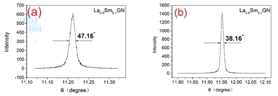 In order to evaluate the crystal quality, the rocking curve of polished (100)-orientation wafers were scanned on HRXRD. The rocking curves of the wafers are shown in Figure 3. The full width at half maximum (FWHM) values of the rocking curves of the polished wafers, with different Sm3+ concentrations were all lower than 50”. The FWHM values of La0.9Sm0.1GN and La0.8Sm0.2GN crystals were, respectively, 47.16” and 38.16”. The results show that the as-grown crystals were of good quality.