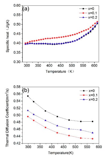 The size of the samples measured for their specific heat was 4 × 4 × 0.5 mm3, and the (100)-orientation samples were polished and uncoated. The thermal diffusion coefficient was measured with Φ10 × 1 mm wafers of (100)-orientation. Figure 6a shows the specific heat results of as-grown crystals, which were measured from room temperature to 573.15 K. We can see that the specific heat rose as the temperature increased temperature. The La0.9Sm0.1GN crystal changed from 0.4 J/−1K−1 to 0.514 J/g−1K−1 and that of La0.8Sm0.2GN rose from 0.394 J/g−1K−1 to 0.508 J/g−1K−1. Both of the La1 − xSmxGN crystals had higher values than the LGN crystal. The results of specific heat indicate that the new crystals are suitable for used in high-power lasers. The thermal diffusion coefficient of crystals is shown in Figure 6b. It can be seen that the thermal diffusion coefficient decreased when the temperature increased. However, both of the La1 − xSmxGN crystals containing the Sm element had lower values than the LGN crystal.