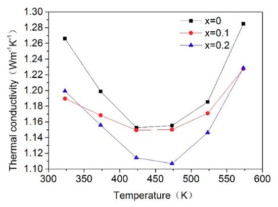 where K is the thermal conductivity, λ, ρ, and Cp, respectively, denote the thermal diffusion coefficient, the density, and the specific heat of the crystal. The calculated results are plotted in Figure 7. The thermal conductivity of as-grown crystals decreased when the temperature reached 500 K and then rose again. The minimum value of specific heat of the crystals was obtained between 425 and 475 K. Compared with the LGN crystal, the maximum reduction in thethermal conductivity was 4.18%. The laser damage threshold was measured at 800 nm with a pulse width of 35 fs. The results of La0.9Sm0.1GN and La0.8Sm0.2GN crystals were, respectively, 188.30 TW/cm2 and 54.84 TW/cm2 lower than LGN crystals by a factor of two and a factor of six, respectively.