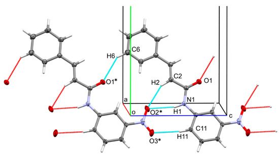 The strongest of these interactions is an N–H⋅⋅⋅O hydrogen bond involving the amide as the H-bond donor, and one of the oxygen’s of the nitro group, O2, as the H-bond acceptor. The short N⋅⋅⋅O distance of 3.1895 (9) Å indicates this interaction to be the strongest individual directional interaction in the lattice of Compound 1. This interaction is augmented by two C–H⋅⋅⋅O interactions that provide synergy to the single N–H⋅⋅⋅O hydrogen bond. H11, trans to the nitro group on the B ring, interacts with the second nitro oxygen atom, O3, and H2 of the alkene is interacting with the same nitro O atom as the amide. The nitro group thus acts as an acceptor for three hydrogen bonds: one strong N–H⋅⋅⋅O and two weaker C–H⋅⋅⋅O interactions. These interactions connect molecules into H-bonded ribbons that stretch along the c-axis direction (Figure 3). The ribbons are stabilized by another C–H⋅⋅⋅O interaction that involves the amide oxygen as the H-bond acceptor, and H6 of the phenyl ring as the donor.