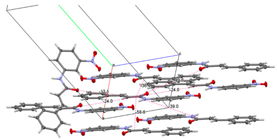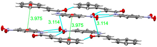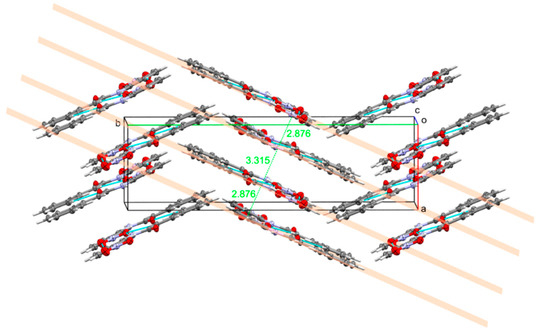 Ribbons are stacked in both directions, up and down, with slightly different interplanar distances. Depending on the exact definition of planes—molecules in H-bonded ribbons are slightly shifted up or down with respect to each other—interplanar spacing’s are between 2.876 and 3.315 Å (other values lie between these two extremes). A representative view of the extended π-stacking is shown in Figure 5. Parallel ribbons are shifted along the planes—mostly along the long unit cell axis (the b-axis).