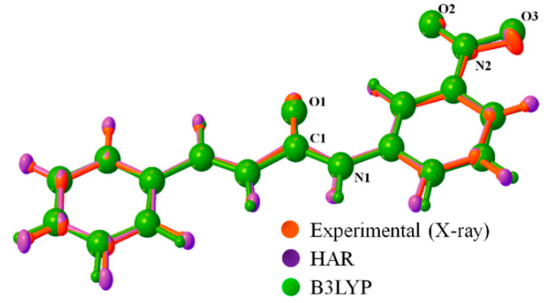 When using HAR, as implemented in Olex2 [12], an improved R-value of 2.23% was observed, as opposed to the Shelxl based AIM model R-value of 4.05%. Specifically, we used HAR with the “Restricted Hartree–Fock” method with the def2-SVP basis set [21,22]. The experimental Shelxl and HAR solid-state geometries for Compound 1 were also compared to DFT calculated gas-phase values. Selected bond distances, bond angles, and torsion angles are given in Table 3. The conformational disagreements amongst the experimental structure (X-ray structure) and optimized equivalents by HAR and the B3LYP functional with 6-311++G(d,p) basis set were determined (Figure 7).
