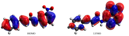 The frontier orbitals were computed using the B3LYP functional and the 6-311++G(d,p) basis set (Figure 8). The HOMO and LUMO of Compound 1 are distributed over the propene amide bridge, phenyl and, nitrophenyl rings. The experimental structure of Compound 1 shows a slight correlation with the reported p-nitrophenyl derivative [34]. The reported structure is more planar than Compound 1, as indicated by a smaller dihedral angle of 3.04 (8)° between the ring A and nitro-substituted ring B.