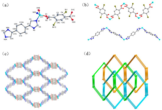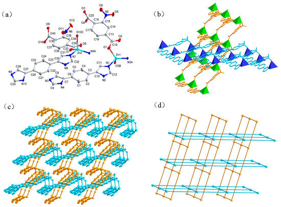 A different H2Brpbda acid with a Br atom substituent group replaced H2NO2pbda in the reaction of 1, and the new compound of 2, possessing 3-fold interpenetrating dmp topology was obtained. Complex 2 crystallizes in the orthorhombic P nna space group, quite different from the monoclinic space group, P 1, in 1. The asymmetric unit includes half of the [Zn(L)(Brpbda)] units, namely half of a distinct Zn(II) atom, a Brpbda2− anion, and an L unit, respectively. As shown in Figure 2a, the Zn1 atom is coordinated by two oxygen atoms (O1, O1A) from two different Brpbda2− anions, and two nitrogen atoms (N3, N3A) of two L ligands, forming distorted tetrahedral coordination geometry. In 2, each Brpbda2− anion links two adjacent Zn2+ ions by two carboxyl groups using the µ1-η1:η0-monodentate coordination mode, generating a 1D zigzag chain along the a axis (Figure 2b). Similarly, the linear L ligands act as 2-connectors to link Zn(II) atoms to form 1D zigzag chains. As a consequence, these 1D chains are interconnected to afford a 3D coordination framework (Figure 2c). Topologically, both the μ2-Brpbda2− anions and the L ligands are linear 2-connectors, while each Zn(II) atom is a 4-connector to connect the other four Zn(II) atoms by two Brpbda2− and two L ligands. Thus, the network of 2 is a 4-connected dmp net with a (65·8) topology [33,34]. Due to the great void of each single net, it permits the inclusion of another two independent equivalent networks, resulting in a 3-fold interpenetrating dmp net (Figure 2d).