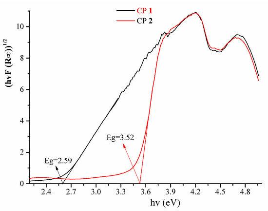 The UV–vis absorption spectra of 1 and 2 in their solid states were recorded in Figure 3. The L ligand shows intense absorption peaks ranging from 250 to 300 nm, which belongs to π−π* transitions [36]. Obviously, the CPs 1 and 2 showed similar absorption bands in the UV region, which correspond to intraligand π → π* and n → π* transitions. Furthermore, the diffuse reflectance data obtained were transformed into a Kubelka–Munk function to get their band gaps (Eg), which can be employed to evaluate the semiconductivity of the CPs. The values of Eg are estimated as 3.52 and 2.59 eV for CPs 1 and 2 (Figure 4), which were determined by a direct band gap semiconductor: (Ahν)2 = B(hν − Eg). The values of Eg for CPs 1 and 2 are comparatively a little higher than the series of Ni(II) compounds [37], and the as-synthesized crystalline materials may be optical semiconductors [38].