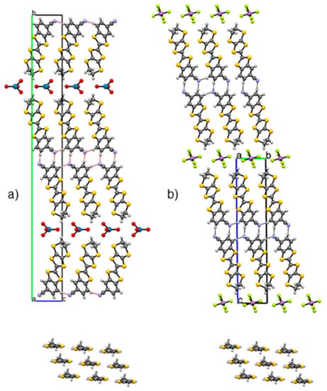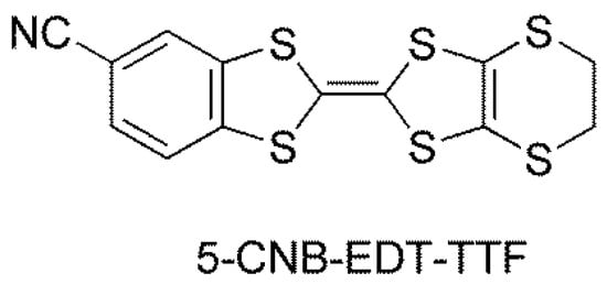 - Rabaça, S.; Oliveira, S.; Gonçalves, A.C.; Gama, V.; Santos, I.C.; Belo, D.; Almeida, M. Cyanobenzene–Ethylenedithio–Tetrathiafulvalene Salts with ClO4−: Bilayer Polymorphs and Different Stoichiometries. Cryst. Growth Des. 2017, 17, 2801–2808. [Google Scholar] [CrossRef]